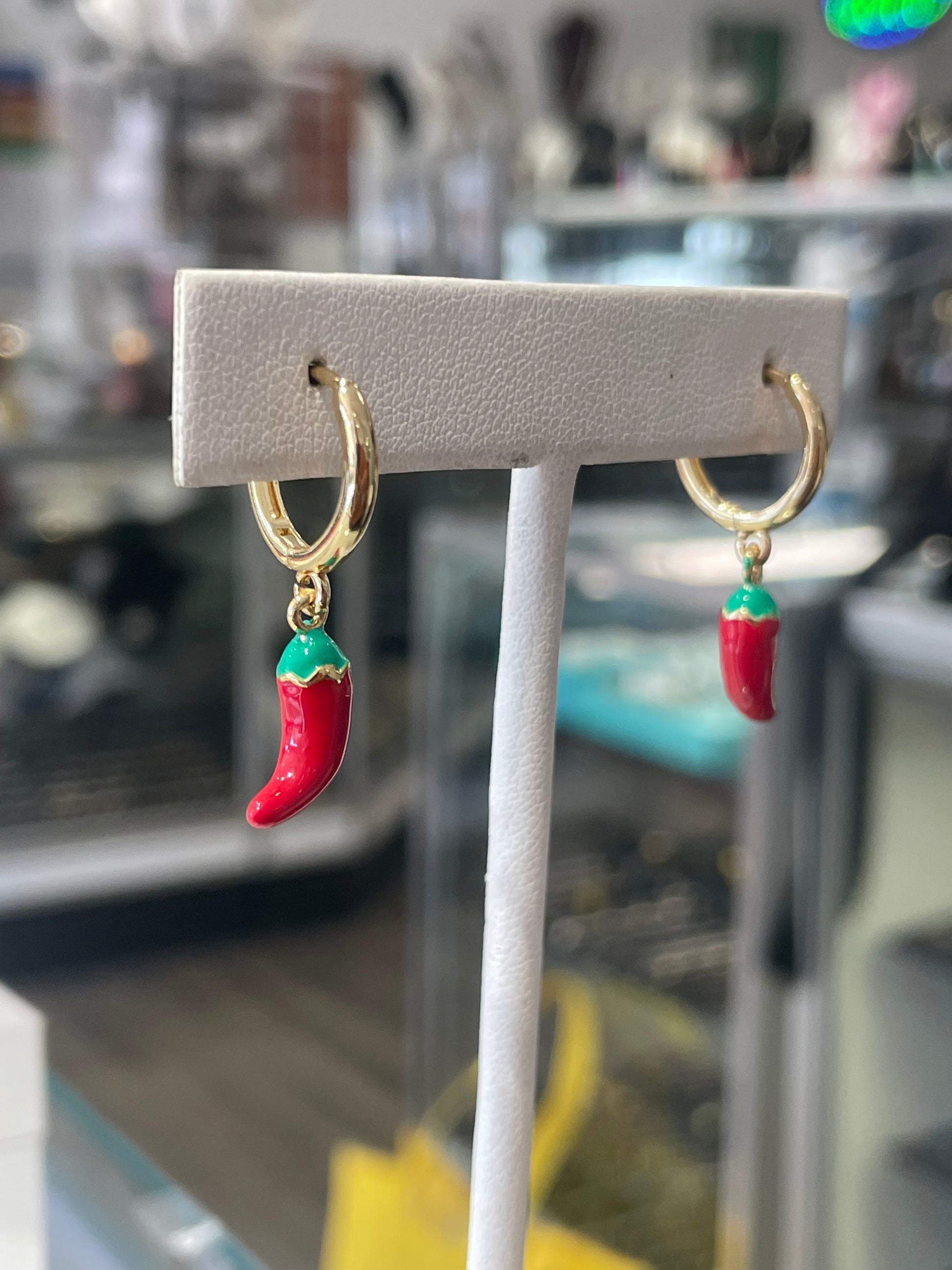 Stainless Steel Vermeil Hot Chili Pepper Dangle Earrings. Huggie Hoop Style. 1” drop.
