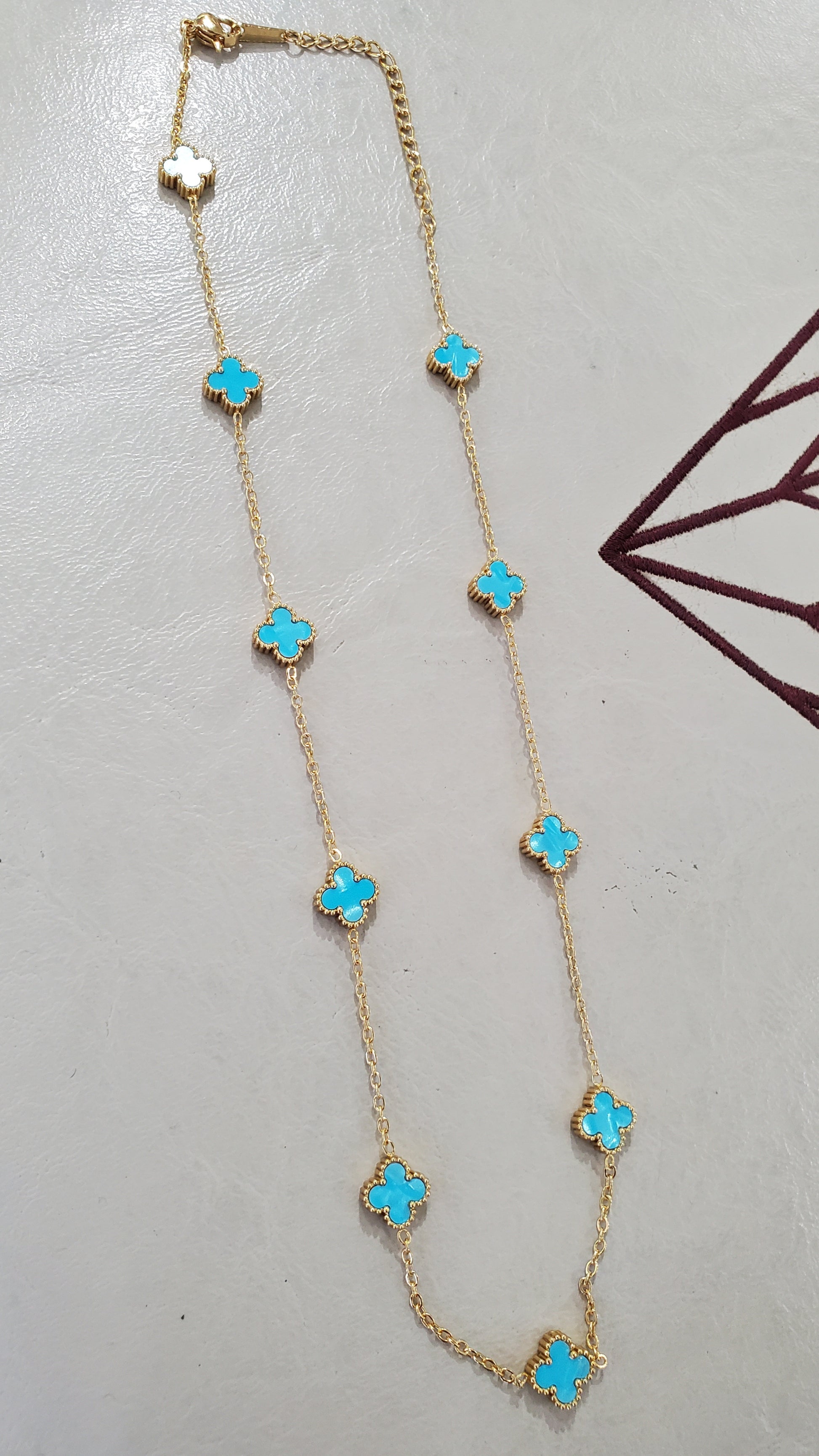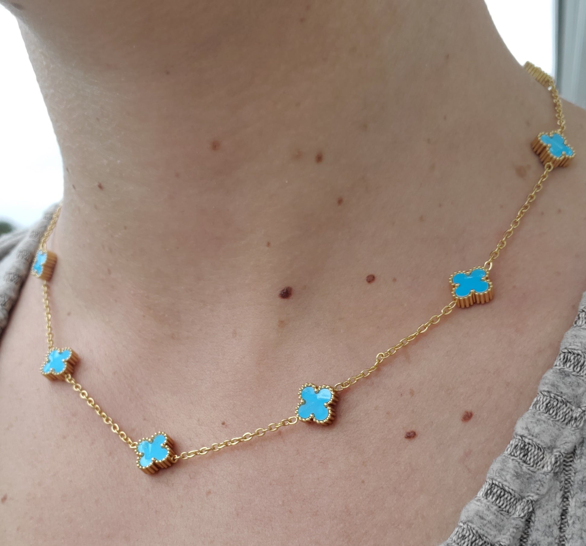 Stainless Steel Vermeil Ladies Sky-blue Quatrefoil Clover Enamel Station Necklace