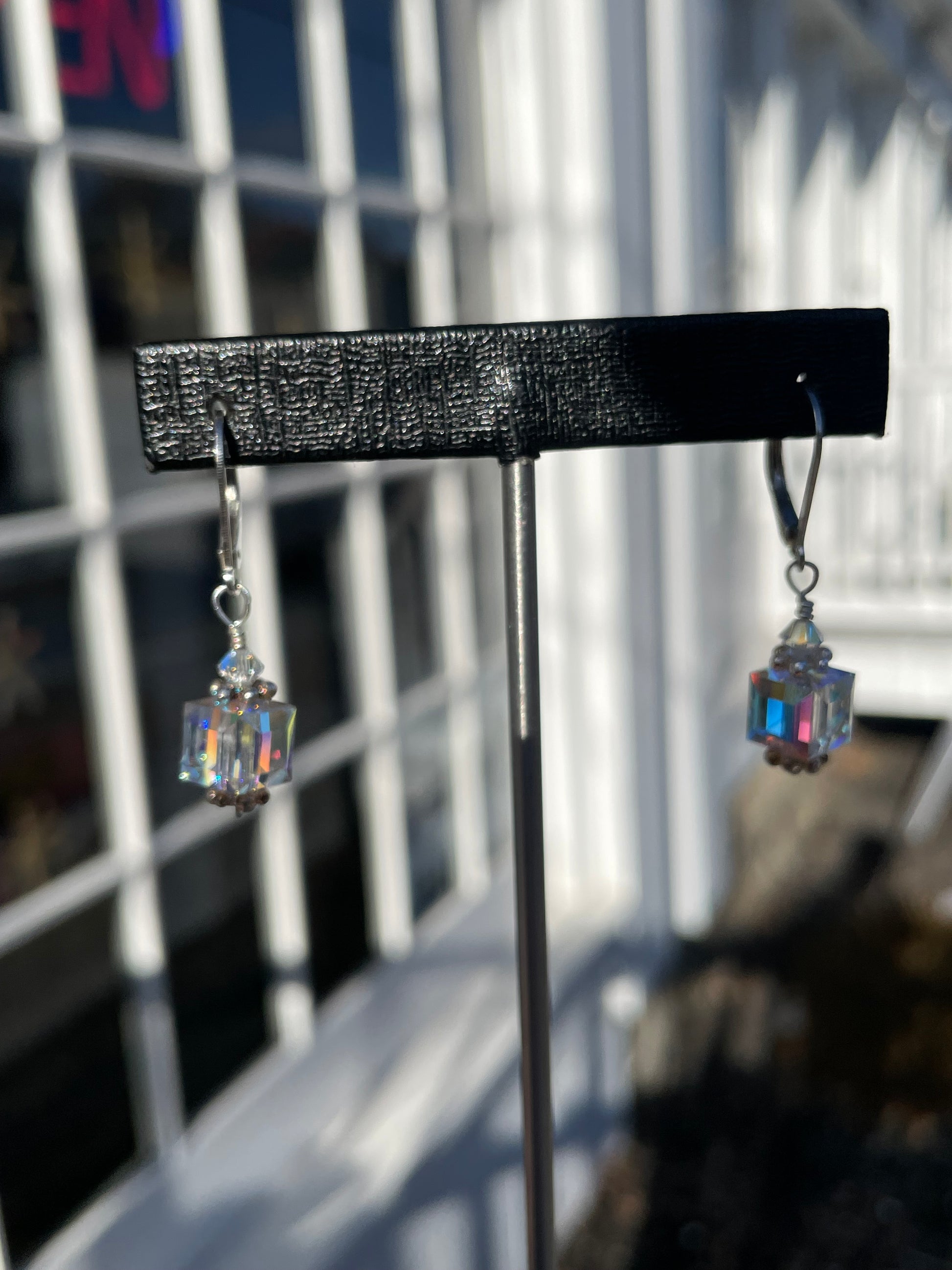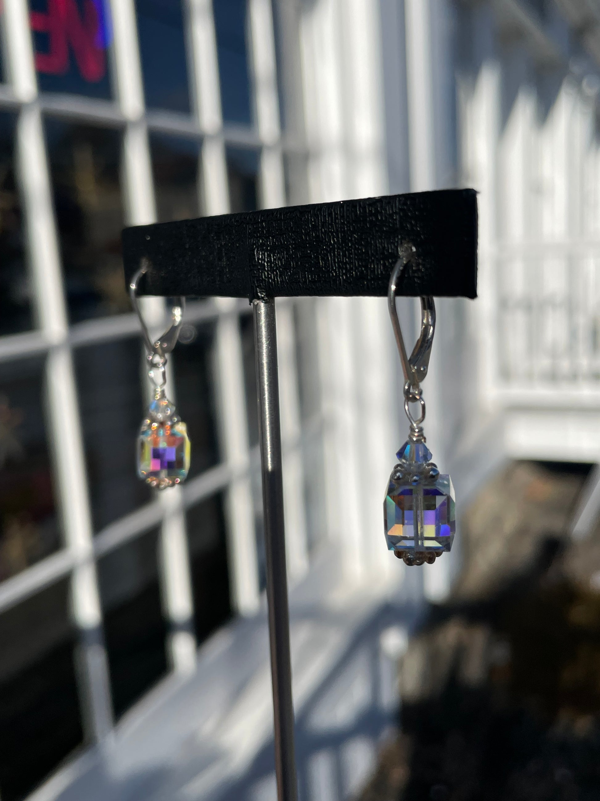 925 Sterling Silver AB Crystal Cube Dangle Earrings.