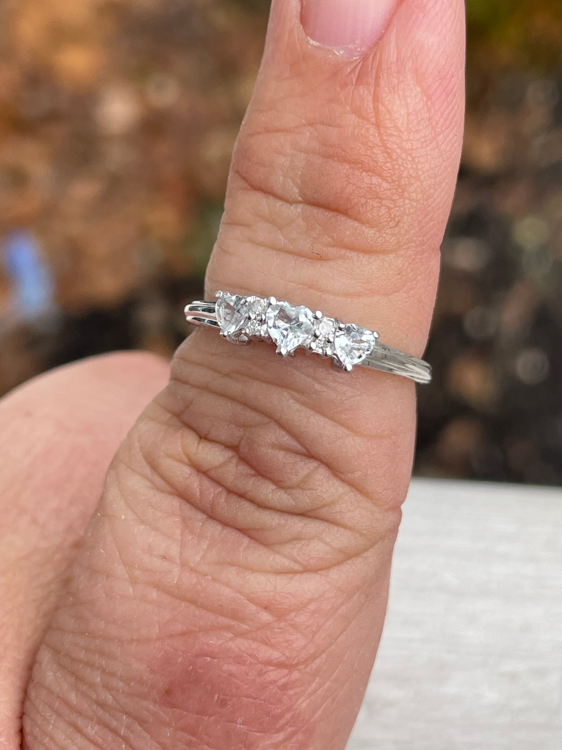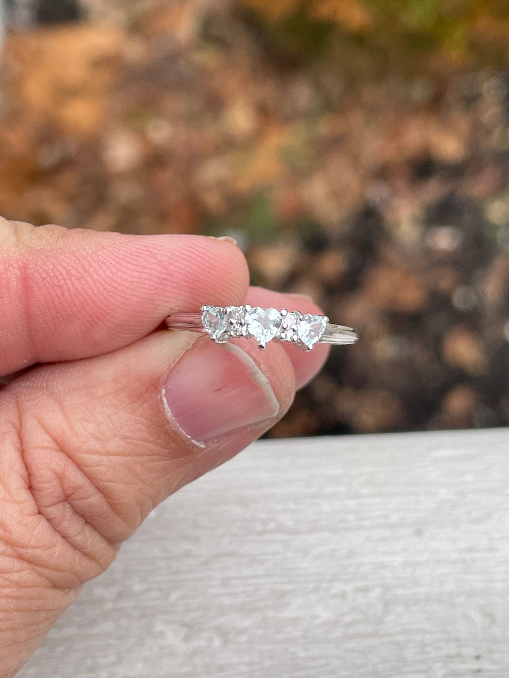10k White Gold Past Present Future Aquamarine & Diamond Heart Band Ring Size 7.5
