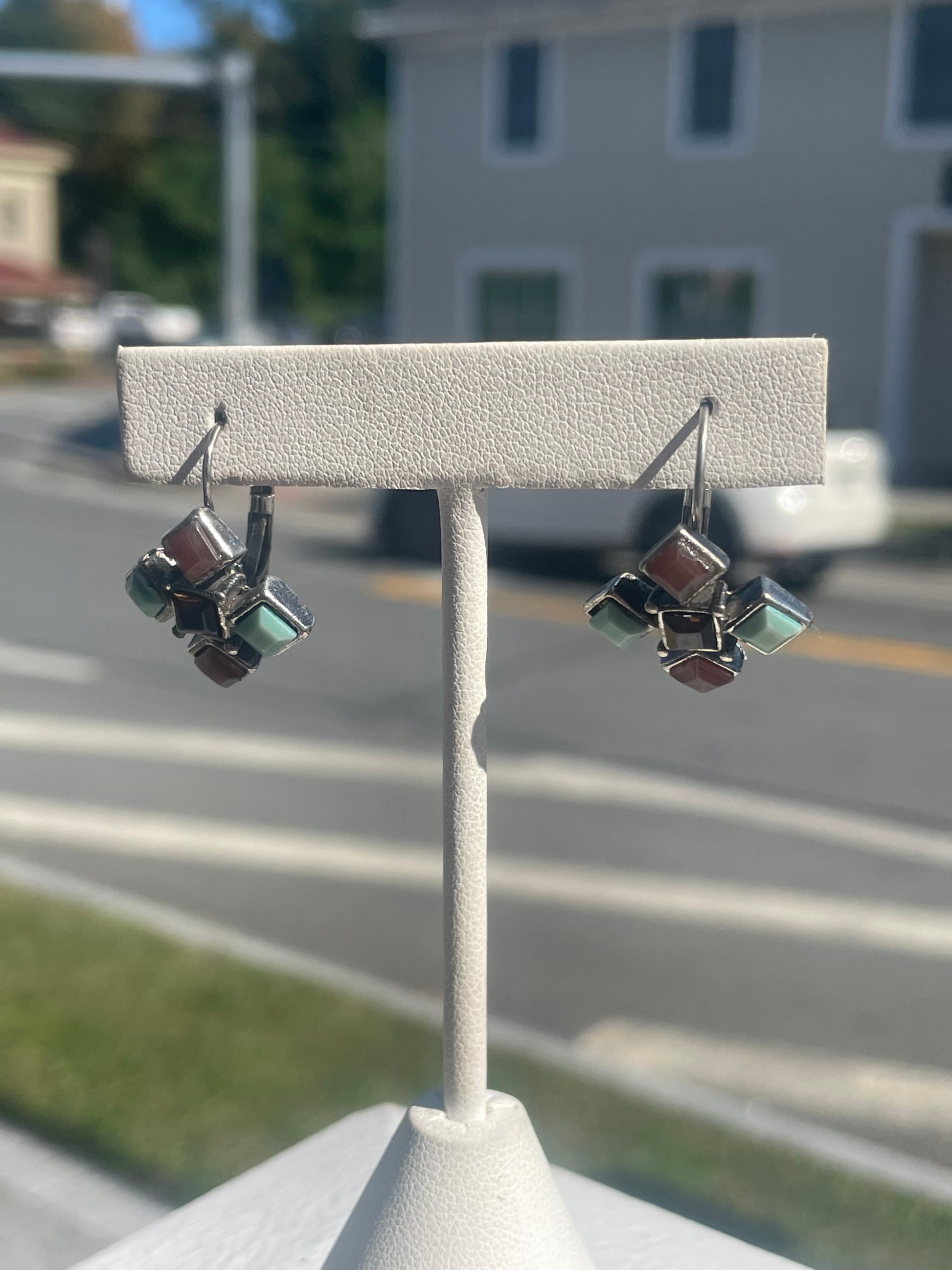 Vintage 925 Sterling Silver Turquoise, Carnelian, and Brown Quartz Cluster Dangle Earrings. Leverback hooks allow the earring to drop slightly.